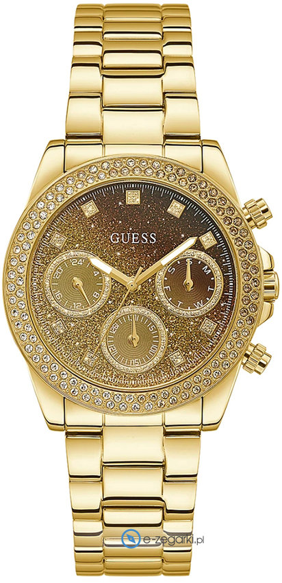 Zegarek damski GW0483L2 marki Guess to dobra propozycja dla osób ceniących sobie dbałość o detale oraz bezawaryjne zachowanie mechanizmów. Ciekawą konstrukcję czasomierza uzyskano dzięki tarczy w kolorze brązowym. Zegarek ten pokazuje godzinę w formacie analogowym dzięki czemu odczyt jest bezproblemowy. Koperta jest w kolorze złotym szeroka jest na 38 mm oraz ma grubość 11 mm - wyróżnia się okrągłym kształtem.