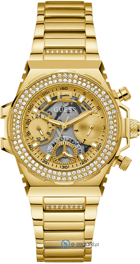 Model GW0552L2 marki Guess to elegancki zegarek naręczny damski, który jest wyposażony w ciekawe rozwiązania i funkcje. Charakteru dodaje wysokiej jakości tarcza w kolorze złotym. Aktualna godzina prezentowana jest w sposób analogowy co intuicyjnie pozwala ją odczytać. Koperta jest w kolorze złotym szeroka jest na 36 mm - posiada okrągły kształt.