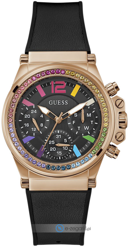 Zegarek damski GW0562L3 marki Guess to stylowe połączenie funkcjonalności i ciekawego wzornictwa. Styl zapewnia wysokiej klasy cyferblat w kolorze czarnym. Zegarek ten pokazuje godzinę w formacie analogowym dzięki czemu odczyt jest bardzo łatwy. Koperta jest ozdobiona kolorem różowo złotym szeroka jest na 39 mm oraz ma grubość 11 mm - cechuje się okrągłym kształtem.