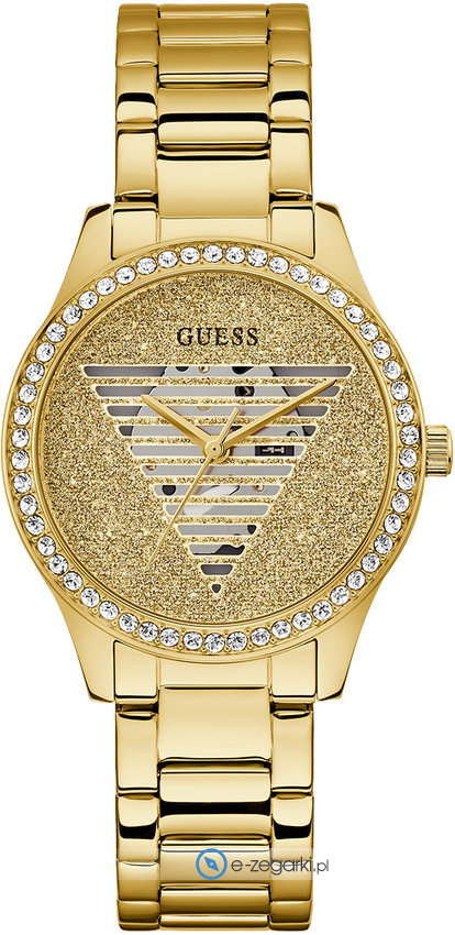 Zegarek damski GW0605L2 marki Guess to dobre połączenie funkcjonalności a także ciekawego designu. Styl zapewnia wysokiej klasy tarcza w kolorze złotym. Zegarek ten prezentuje aktualny czas w formacie analogowym dzięki czemu odczyt jest bardzo łatwy. Koperta jest w kolorze złotym szeroka jest na 38 mm oraz ma grubość 9 mm - wyróżnia się okrągłym kształtem.