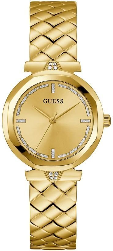 Damski zegarek Guess GW0613L2 to zegarek, który dzięki swemu wzornictwu zawsze będzie prezentował się dobrze. Stylu dodaje wysokiej jakości tarcza w kolorze złotym. Aktualna godzina przedstawiona jest w sposób analogowy co bez trudu pozwala ją odczytać. Koperta w barwach koloru złotego szeroka jest na 34 mm oraz ma grubość 9 mm - posiada okrągły kształt.