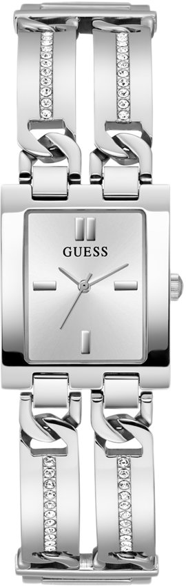 Damski zegarek Guess GW0668L1 to zegarek, który dzięki swemu wzornictwu zawsze będzie prezentował się dobrze. Atrakcyjną budowę zegarka osiągnięto z pomocą tarczy w kolorze srebrnym. Aktualna godzina przedstawiona jest w sposób analogowy co intuicyjnie pozwala ją odczytać. Koperta jest pokryta kolorem srebrnym szeroka jest na 24 mm - posiada prostokątny kształt.