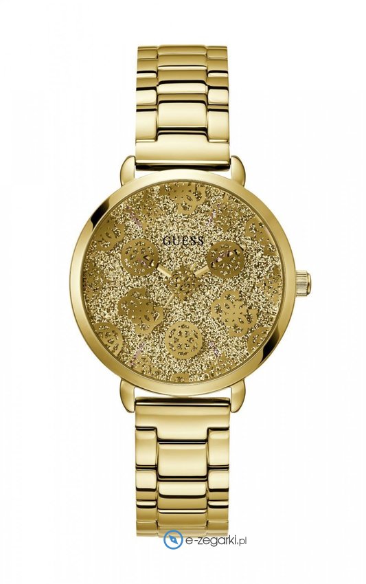 Zegarek damski GW0670L2 marki Guess to ciekawa pozycja dla ludzi ceniących sobie dbałość o detale oraz bezproblemowe działanie mechanizmów. Charakterystyczną budowę zegarka uzyskano dzięki tarczy w kolorze złotym. Aktualna godzina prezentowana jest w sposób analogowy co bez trudu pozwala ją odczytać. Koperta jest w kolorze złotym szeroka jest na 38 mm - posiada okrągły kształt.