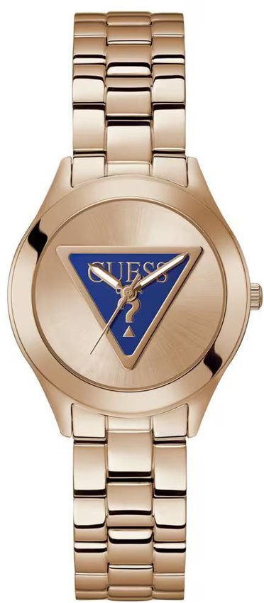 Model GW0675L3 marki Guess to gustowny zegarek naręczny damski, który łączy w sobie ciekawe rozwiązania i funkcje. Charakteru dodaje wysokiej jakości cyferblat w kolorze niebieskim, który przyciąga wzrok i nadaje mu unikalnego charakteru. Zegarek ten prezentuje godzinę w formacie analogowym, dzięki czemu odczyt jest intuicyjny i szybki. Koperta w odcieniach koloru różowo złotego szeroka jest na 34 mm oraz ma grubość 10 mm - wyróżnia się okrągłym kształtem, idealnym na damski nadgarstek.