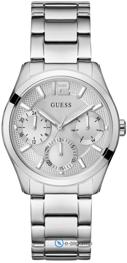 Zegarek damski GW0760L1 marki Guess to dobre połączenie funkcjonalności oraz ciekawego designu. Wysokiej jakości cyferblat zegarka pokryto srebrnym kolorem. Godzina pokazywana jest w sposób analogowy co bez trudu pozwala ją odczytać. Koperta jest ozdobiona kolorem srebrnym szeroka jest na 38 mm - posiada okrągły kształt.