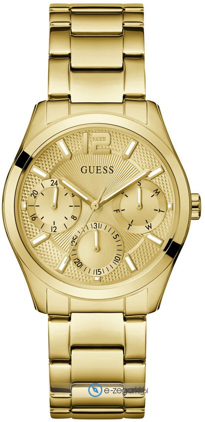 Zegarek damski GW0760L2 marki Guess to stylowe połączenie funkcjonalności a także ciekawego designu. Charakteru nadaje wysokiej klasy cyferblat w kolorze złotym. Zaprezentowana metodą analogową aktualna godzina jest czytelna i szybka do sprawdzenia. Koperta jest w kolorze złotym szeroka jest na 38 mm - posiada okrągły kształt.