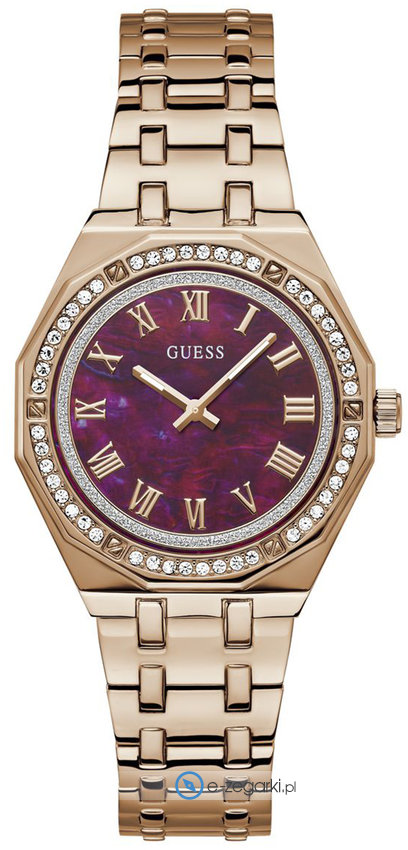 Zegarek damski GW0770L3 marki Guess to dobra pozycja dla osób ceniących sobie dbałość o detale a także bezproblemowe funkcjonowanie mechanizmów. Niebanalną konstrukcję zegarka uzyskano dzięki tarczy w kolorze fioletowym. Aktualna godzina zaprezentowana jest w sposób analogowy co intuicyjnie pozwala ją odczytać. Koperta jest w kolorze różowo złotym szeroka jest na 35 mm oraz ma grubość 9 mm - cechuje się okrągłym kształtem.