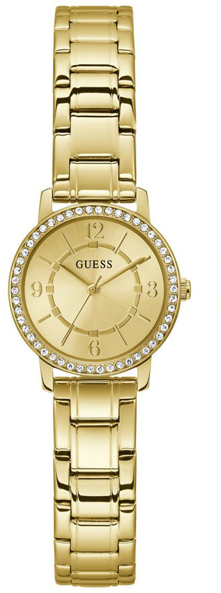 Zegarek damski GW0808L2 marki Guess to dobre połączenie funkcjonalności i modnego wzornictwa. Ciekawy wygląd czasomierza osiągnięto również dzięki tarczy w kolorze złotym. Pokazana metodą analogową bieżąca godzina jest czytelna i szybka do odczytania. Koperta jest w kolorze złotym szeroka jest na 28 mm - ma okrągły kształt.