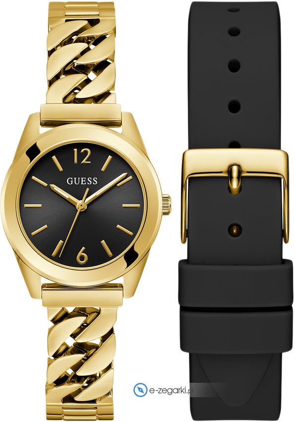 Zegarek damski GW0845L2 marki Guess to dobre połączenie funkcjonalności i ciekawego wzornictwa. Charakterystyczny wygląd zegarka uzyskano m.in. poprzez tarczę w kolorze czarnym. Pokazana metodą analogową aktualna godzina jest czytelna i łatwa do odczytania. Koperta jest ozdobiona kolorem złotym szeroka jest na 32 mm - cechuje się okrągłym kształtem.