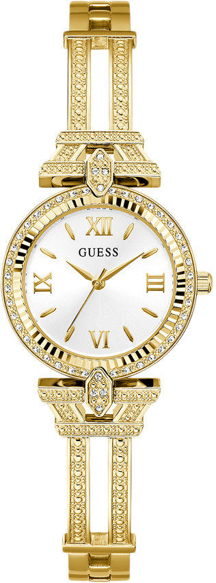 Zegarek damski GW0864L2 marki Guess to stylowe połączenie funkcjonalności oraz ciekawego designu. Tarcza zegarka jest w kolorze białym. Zaprezentowana metodą analogową aktualna godzina jest czytelna i prosta do odczytania. Koperta w barwach koloru złotego szeroka jest na 28 mm - posiada okrągły kształt.