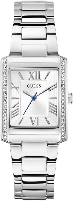 Model GW0874L1 marki Guess to elegancki zegarek naręczny damski, który posiada ciekawe rozwiązania i funkcje. Stylu dodaje wysokiej klasy tarcza w kolorze srebrnym. Aktualna godzina przedstawiona jest w sposób analogowy co niezmiernie łatwo pozwala ją odczytać. Koperta jest w kolorze srebrnym szeroka jest na 27 mm - ma prostokątny kształt.
