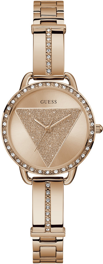 Zegarek damski GW0914L3 marki Guess to ciekawa pozycja dla ludzi ceniących sobie dbałość o detale jak również bezawaryjne funkcjonowanie mechanizmów. Styl zapewnia wysokiej jakości cyferblat w kolorze różowo złotym. Zegarek ten pokazuje aktualny czas w formacie analogowym dzięki temu odczyt jest intuicyjny. Koperta w barwach koloru różowo złotego szeroka jest na 30 mm oraz ma grubość 9 mm - ma okrągły kształt.