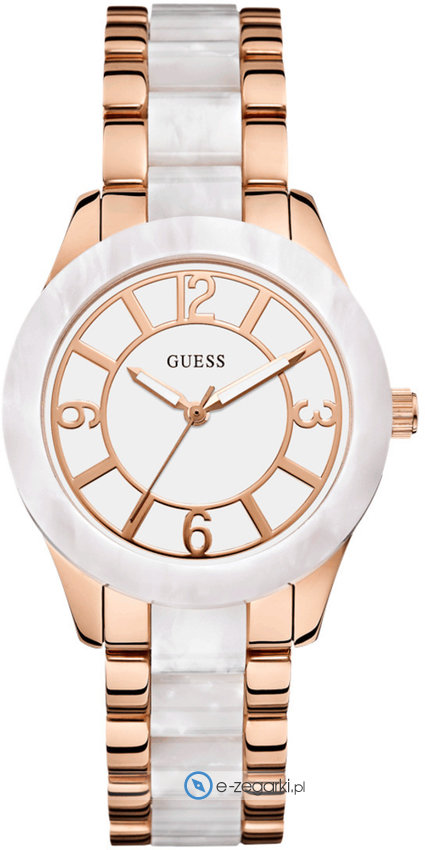 Zegarek damski W0074L2 marki Guess to harmonijne połączenie funkcjonalności i ciekawego designu. Niebanalny wygląd czasomierza uzyskano dzięki tarczy w kolorze białym. Zegarek ten prezentuje aktualny czas w formacie analogowym, dzięki czemu odczyt jest intuicyjny. Koperta w kolorze różowego złota o szerokości 37 mm wyróżnia się okrągłym kształtem. Ten model idealnie sprawdzi się na każdym kobiecym nadgarstku, podkreślając jego subtelność i biżuteryjny charakter.