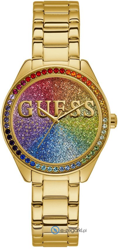 Model W0987L5 marki Guess to stylowy zegarek naręczny damski, który jest wyposażony w ciekawe rozwiązania oraz funkcje. Zaprezentowana metodą analogową bieżąca godzina jest czytelna i łatwa do odczytania. Koperta jest ozdobiona kolorem złotym szeroka jest na 37 mm oraz ma grubość 12 mm - w kształcie okrągłym.