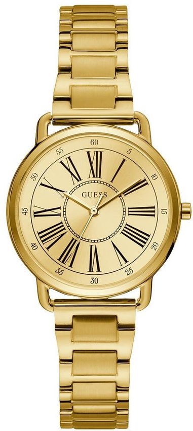 Zegarek damski W1148L2 marki Guess to idealne połączenie funkcjonalności a także ciekawego wzornictwa. Charakterystyczną budowę czasomierza uzyskano dzięki tarczy w kolorze złotym. Koperta jest ozdobiona kolorem złotym szeroka jest na 34 mm oraz ma grubość 9 mm - posiada okrągły kształt.