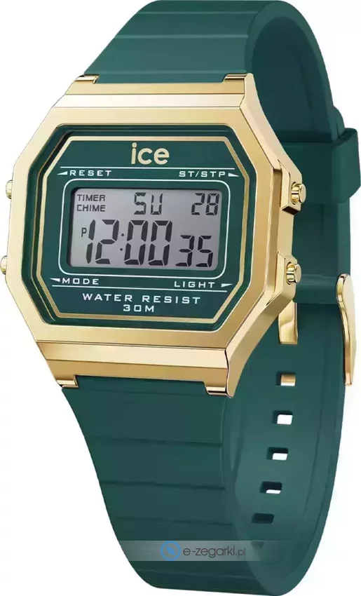 Model damski 022069 marki Ice Watch należy do rodziny Ice Watch Digi Retro. Zegarek ten pokazuje aktualny czas w formacie cyfrowym dzięki czemu odczyt jest bezproblemowy. Koperta została pokryta kolorem złotym szeroka jest na 32 mm - posiada ośmiokątny kształt.