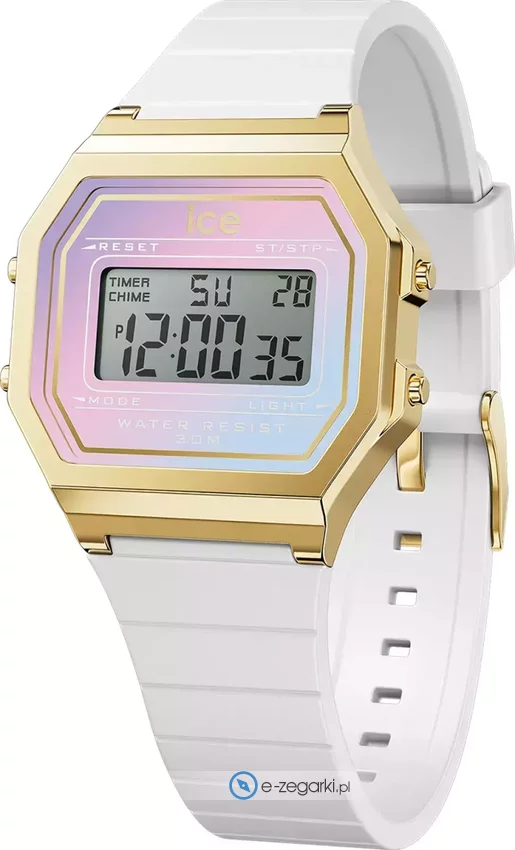 Zegarek 022722 marki Ice Watch to stylowy zegarek naręczny damski, który posiada ciekawe rozwiązania i funkcje. Model ten zalicza się do serii Ice Watch Digit Retro. Zegarek ten pokazuje aktualny czas w formacie cyfrowym dzięki temu odczyt jest bezproblemowy. Koperta w barwach koloru złotego szeroka jest na 32 mm - w kształcie prostokątnym.