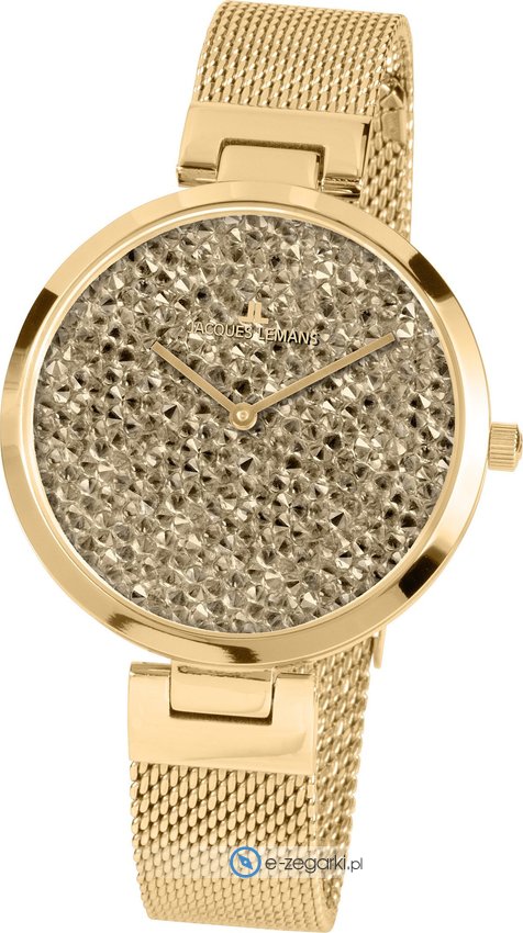 Model JL 1-2035K marki Jacques Lemans to gustowny zegarek naręczny damski, który jest wyposażony w ciekawe rozwiązania i funkcje. Charakter zapewnia wysokiej jakości tarcza w kolorze złotym. Zaprezentowana metodą analogową aktualna godzina jest czytelna i szybka do odczytania. Koperta w barwach koloru złotego szeroka jest na 36 mm - posiada okrągły kształt.