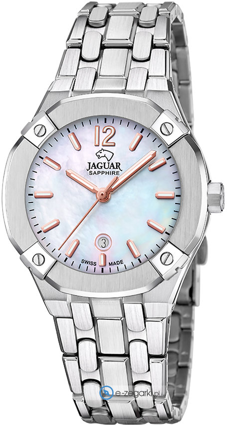 Model J1016-1 marki Jaguar to elegancki zegarek naręczny damski, który jest wyposażony w pomysłowe rozwiązania oraz funkcje. Cyferblat zegarka jest w kolorze perłowym. Aktualna godzina przedstawiona jest w sposób analogowy co intuicyjnie pozwala ją odczytać. Koperta szeroka jest na 35 mm - cechuje się okrągłym kształtem.