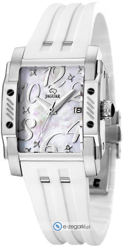 Model J647-1 marki Jaguar to stylowy zegarek naręczny damski, który jest wyposażony w ciekawe rozwiązania i funkcje. Tarcza zegarka w kolorze perłowym. Aktualna godzina przedstawiona jest w sposób analogowy co bez trudu pozwala ją odczytać. Koperta szeroka jest na 28 mm.