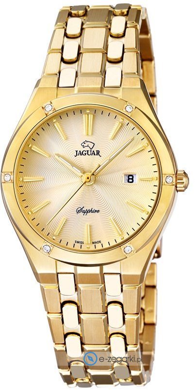 Model J672-2 marki Jaguar to elegancki zegarek naręczny damski, który posiada pomysłowe rozwiązania oraz funkcje. Charakterystyczną konstrukcję zegarka osiągnięto z pomocą tarczy w kolorze złotym. Zegarek ten pokazuje godzinę w formacie analogowym dzięki czemu odczyt jest intuicyjny. Koperta szeroka jest na 32 mm - wyróżnia się okrągłym kształtem.