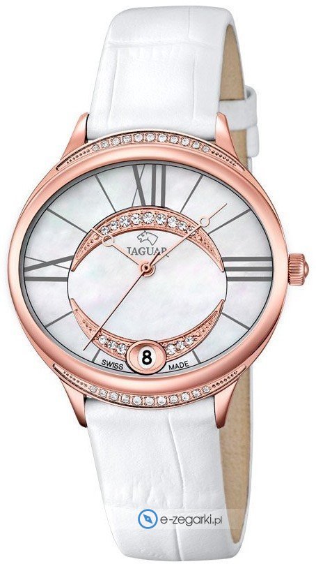 Model J804-1 marki Jaguar to elegancki zegarek naręczny damski, który wyposażono w pomysłowe rozwiązania oraz funkcje. Wysokiej trwałości tarczę zegarka pokryto perłowym kolorem. Zegarek ten pokazuje aktualny czas w formacie analogowym dzięki temu odczyt jest bezproblemowy. Koperta szeroka jest na 34 mm - cechuje się okrągłym kształtem.