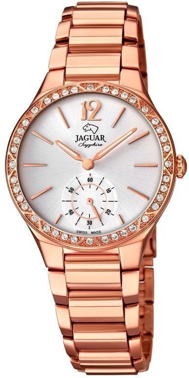 Zegarek damski J819-1 marki Jaguar to dobra propozycja dla ludzi ceniących sobie dbałość o szczegóły jak również bezproblemowe funkcjonowanie mechanizmów. Wysokiej jakości cyferblat zegarka ozdobiono srebrnym kolorem. Pokazana metodą analogową aktualna godzina jest czytelna i łatwa do sprawdzenia. Koperta szeroka jest na 31 mm - w kształcie okrągłym.