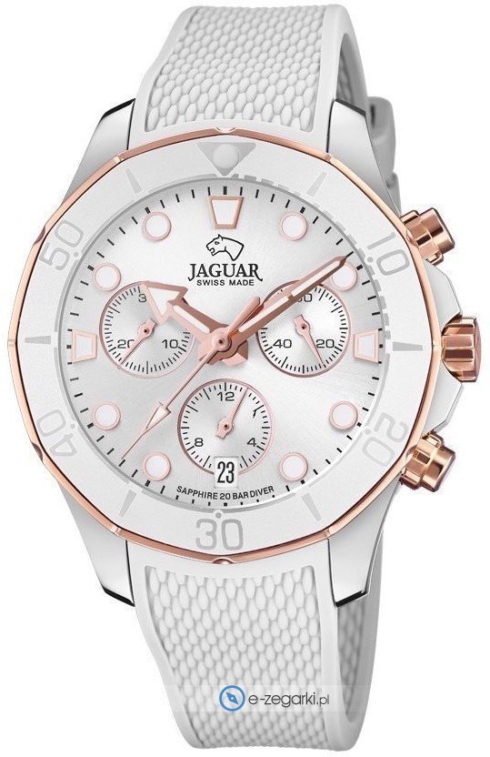 W świecie okazałych marek nie może zabraknąć marki Jaguar. Mało kto wie, że czasomierze Jaguar wytwarzane są w Szwajcarii już od 1938 roku. Zegarki tego producenta od samego początku wyróżniają się na tle konkurencji, mają swoją osobowość. Wraz z zastosowaną tu skrupulatnością i materiałami z najwyższej światowej klasy w zegarkach Jaguar można zastać nowości technologiczne oraz wspomniany wcześniej niebanalny design. Widoczny na tarczy każdego zegarka Jaguar symbol Swiss Made jest podkreśleniem stosowanych najwyższych standardów szwajcarskiej myśli zegarmistrzowskiej cenionej na całym świecie.