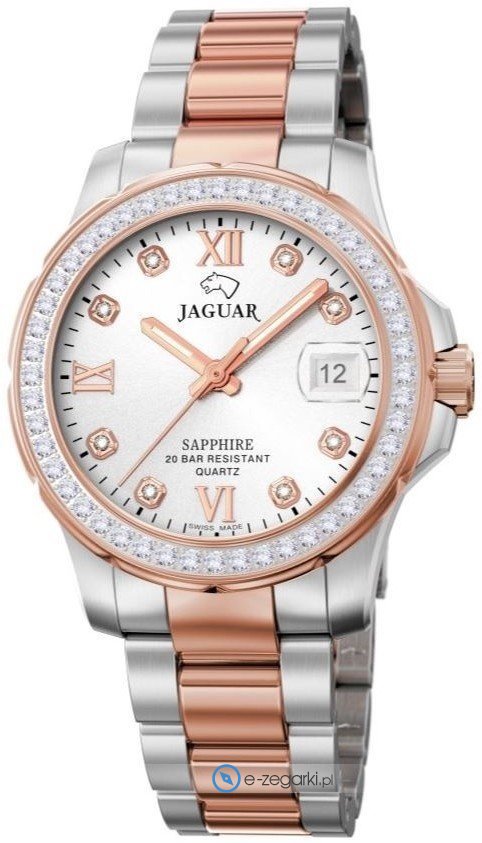 Model J894-1 marki Jaguar to gustowny zegarek naręczny damski, który posiada pomysłowe rozwiązania i funkcje. Nieschematyczny wygląd czasomierza uzyskano także dzięki tarczy w kolorze srebrnym. Godzina pokazywana jest w sposób analogowy co intuicyjnie pozwala ją odczytać. Koperta szeroka jest na 35 mm - w kształcie okrągłym.