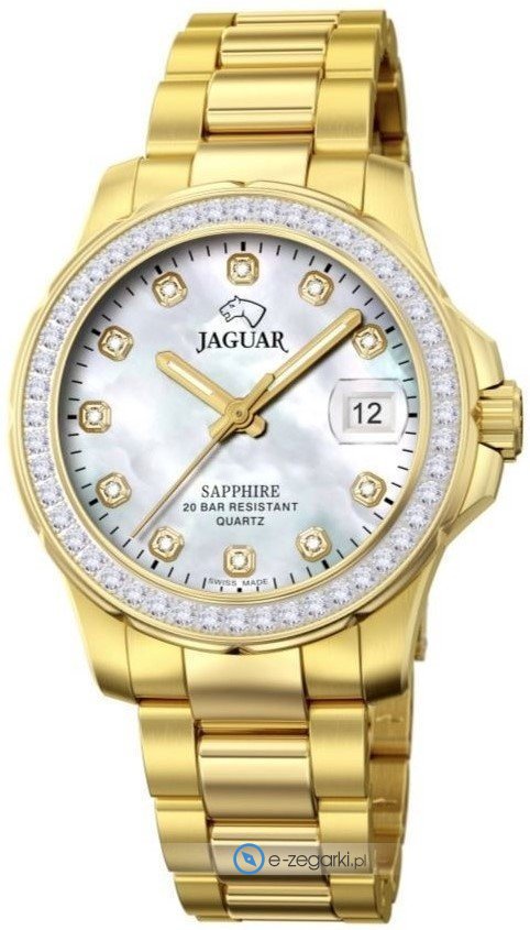 Damski zegarek Jaguar J895-1 to zegarek, który dzięki swemu wzornictwu zawsze będzie prezentował się dobrze. Tarcza zegarka jest w kolorze perłowym. Pokazana metodą analogową aktualna godzina jest czytelna i łatwa do odczytania. Koperta jest w kolorze złotym szeroka jest na 35 mm oraz ma grubość 11 mm - w kształcie okrągłym.