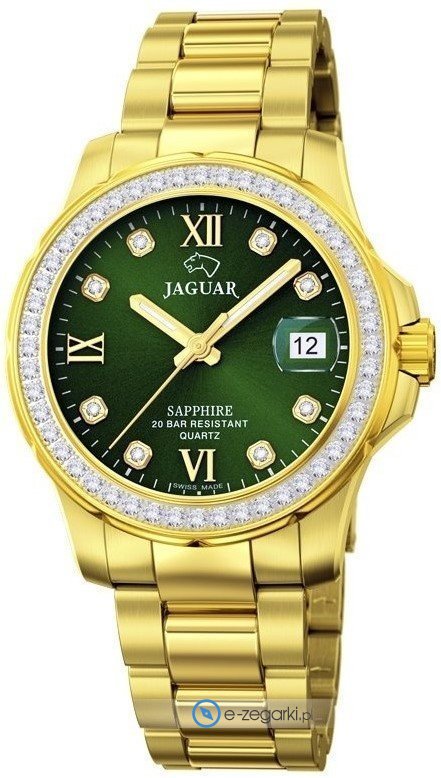 Zegarek damski J895-2 marki Jaguar to dobre połączenie funkcjonalności i ciekawego designu. Charakter zapewnia wysokiej klasy tarcza w kolorze zielonym. Zaprezentowana metodą analogową aktualna godzina jest czytelna i prosta do sprawdzenia. Koperta w barwach koloru złotego szeroka jest na 35 mm oraz ma grubość 11 mm - ma okrągły kształt.