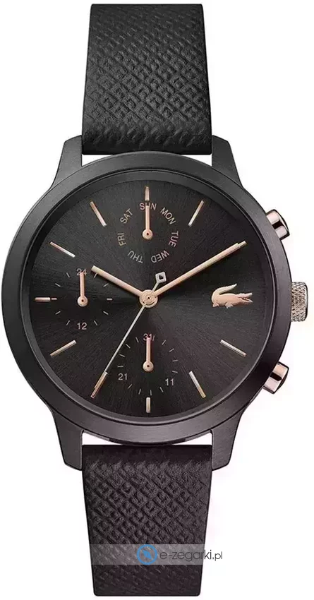 Model 2001153 marki Lacoste to gustowny zegarek naręczny damski, który jest wyposażony w pomysłowe rozwiązania oraz funkcje. Niestereotypowy wygląd czasomierza uzyskano m.in. poprzez cyferblat w kolorze czarnym. Aktualna godzina zaprezentowana jest w sposób analogowy co intuicyjnie pozwala ją odczytać. Koperta w barwach koloru czarnego szeroka jest na 36 mm oraz ma grubość 10 mm - wyróżnia się okrągłym kształtem.