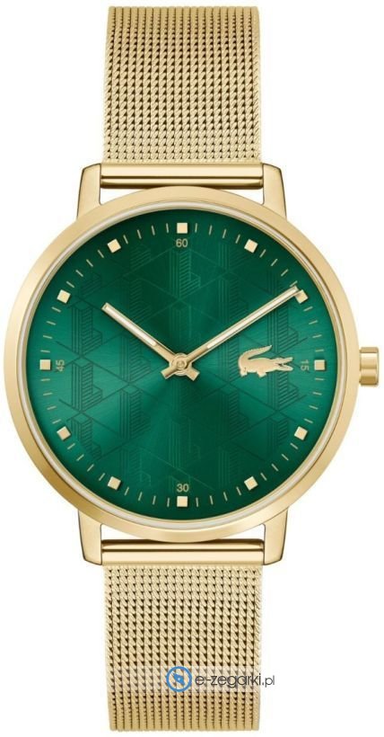 Model 2001356 marki Lacoste to elegancki zegarek naręczny damski, który jest wyposażony w pomysłowe rozwiązania oraz funkcje. Ciekawy wygląd czasomierza osiągnięto również dzięki tarczy w kolorze zielonym. Pokazana metodą analogową aktualna godzina jest czytelna i prosta do sprawdzenia. Koperta w barwach koloru złotego szeroka jest na 35 mm oraz ma grubość 6 mm - wyróżnia się okrągłym kształtem.