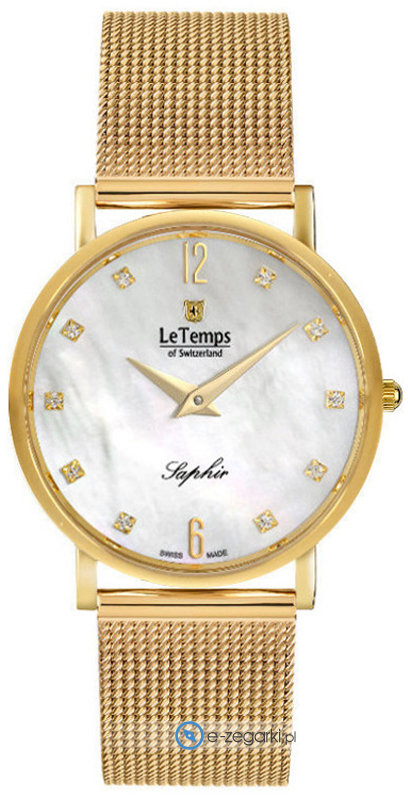 Zegarek damski LT1085.65BD01 marki Le Temps to dobra propozycja dla ludzi ceniących sobie dbałość o szczegóły jak również bezproblemowe działanie mechanizmów. Styl zapewnia wysokiej klasy tarcza w kolorze perłowym. Pokazana metodą analogową bieżąca godzina jest czytelna i łatwa do odczytania. Koperta została pokryta kolorem złotym szeroka jest na 34 mm oraz ma grubość 5 mm - ma okrągły kształt.