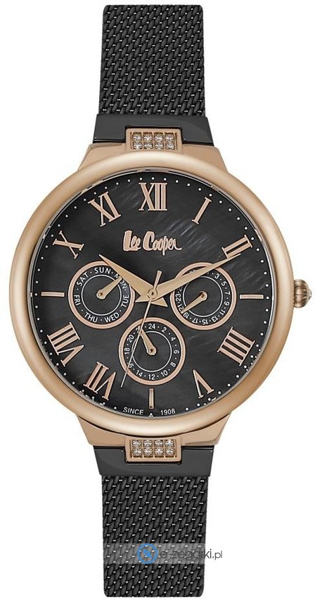 Damski zegarek Lee Cooper LC06521.450 to zegarek, który dzięki swemu wzornictwu zawsze będzie prezentował się dobrze. Tarcza zegarka w kolorze czarnym. Koperta szeroka jest na 36 mm - posiada okrągły kształt.
