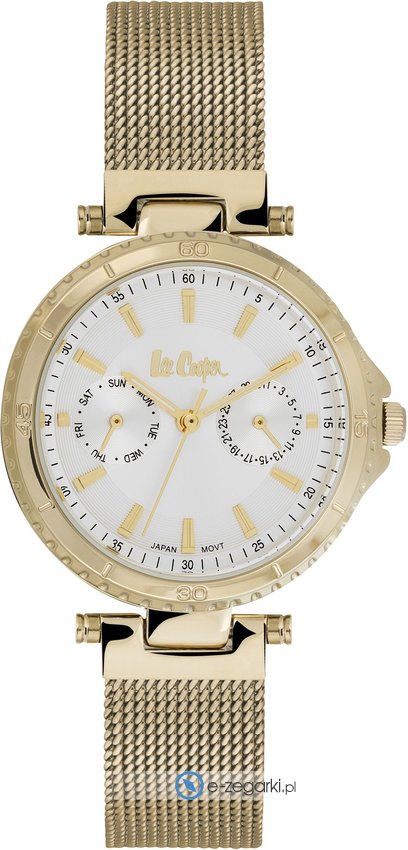 Model LC06599.130 marki Lee Cooper to elegancki zegarek naręczny damski, który jest wyposażony w pomysłowe rozwiązania i funkcje. Niebanalną konstrukcję zegarka osiągnięto z pomocą tarczy w kolorze białym. Koperta jest w kolorze złotym szeroka jest na 34 mm - w kształcie okrągłym.