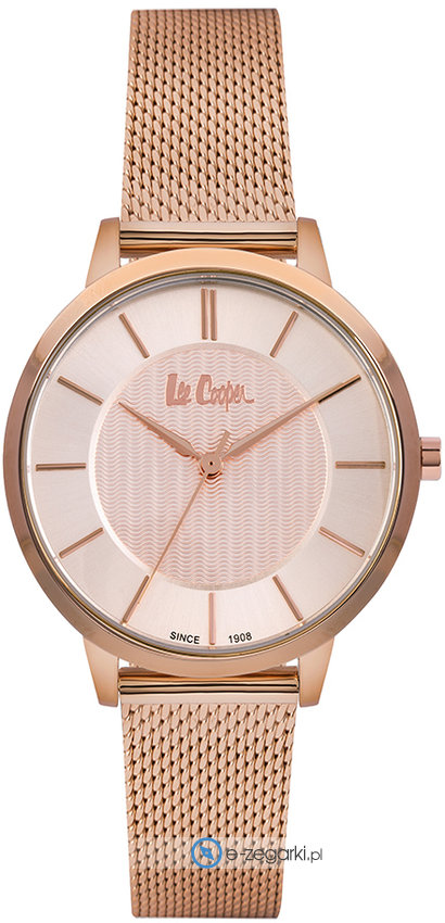 Damski zegarek Lee Cooper LC06872.410 to zegarek, który dzięki swemu wzornictwu zawsze będzie prezentował się dobrze. Wysokiej trwałości cyferblat zegarka pokryto różowo złotym kolorem. Koperta szeroka jest na 38 mm.