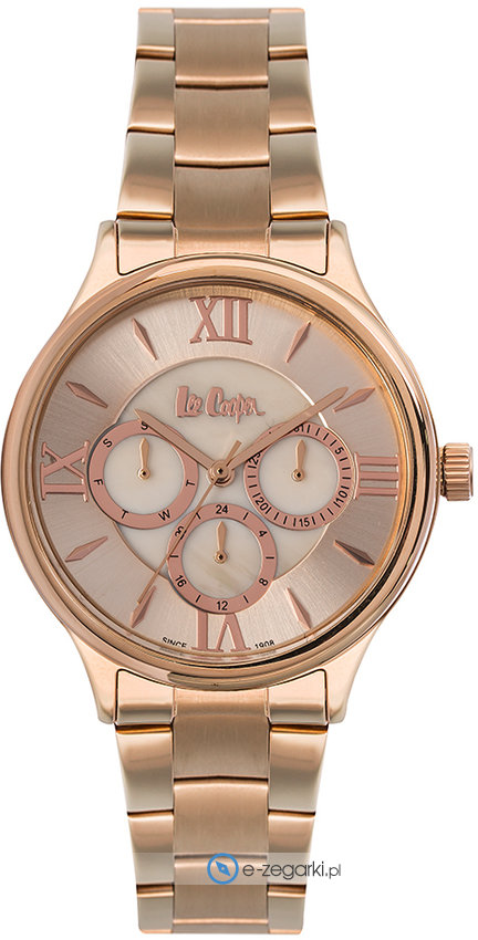 Zegarek LC06933.410 zasilany jest bateryjnie - ogniwo kwarcowe. Odporna na korozję oraz działanie czynników atmosferycznych bransoleta w tonacji koloru różowo złotego zapewnia wysoką jakość i trwałość.
