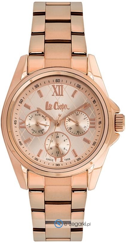 Model LC06975.410 marki Lee Cooper to stylowy zegarek naręczny damski, który posiada ciekawe rozwiązania oraz funkcje. Wysokiej trwałości tarczę zegarka pokryto różowo złotym kolorem. Zaprezentowana metodą analogową aktualna godzina jest czytelna i łatwa do odczytania. Koperta szeroka jest na 38 mm - ma okrągły kształt.