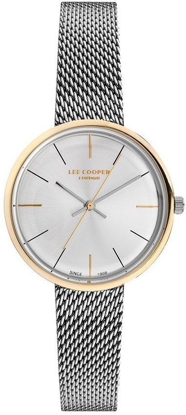 Zegarek damski LC07031.230 marki Lee Cooper to ciekawa pozycja dla osób ceniących sobie dbałość o detale a także bezawaryjne funkcjonowanie mechanizmów. Ciekawy wygląd zegarka uzyskano także dzięki tarczy w kolorze srebrnym. Godzina zaprezentowana jest w sposób analogowy co intuicyjnie pozwala ją odczytać. Koperta jest pokryta kolorem srebrno złotym szeroka jest na 34 mm oraz ma grubość 9 mm - ma okrągły kształt.