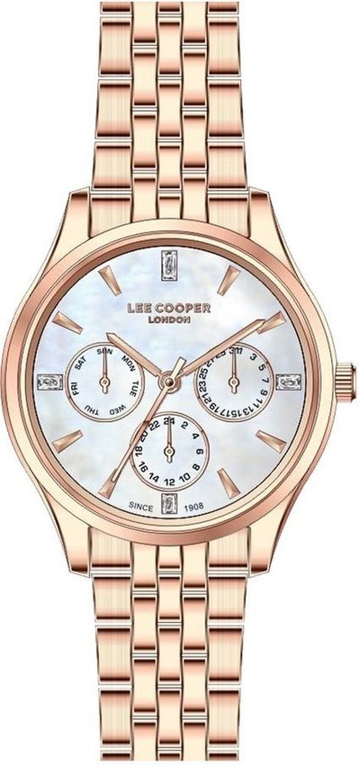 Zegarek damski LC07037.410 marki Lee Cooper to dobra propozycja dla osób ceniących sobie dbałość o detale oraz bezawaryjne działanie mechanizmów. Ciekawą budowę zegarka uzyskano dzięki tarczy w kolorze różowo złotym. Zaprezentowana metodą analogową aktualna godzina jest czytelna i prosta do odczytania. Koperta szeroka jest na 35 mm - wyróżnia się okrągłym kształtem.