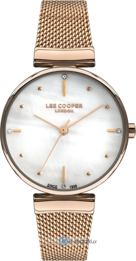 Damski zegarek Lee Cooper LC07231.420 to zegarek, który dzięki swemu wzornictwu zawsze będzie prezentował się dobrze. Cyferblat zegarka jest w kolorze białym. Zegarek ten pokazuje godzinę w formacie analogowym dzięki czemu odczyt jest bezproblemowy. Koperta jest pokryta kolorem różowo złotym szeroka jest na 34 mm - ma okrągły kształt.