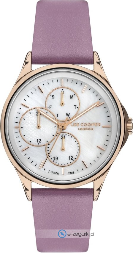 Zegarek damski LC07243.438 marki Lee Cooper to dobre połączenie funkcjonalności i ciekawego designu. Ciekawy wygląd zegarka uzyskano również dzięki tarczy w kolorze białym. Godzina prezentowana jest w sposób analogowy co intuicyjnie pozwala ją odczytać. Koperta jest w kolorze różowo złotym szeroka jest na 36 mm - ma okrągły kształt.