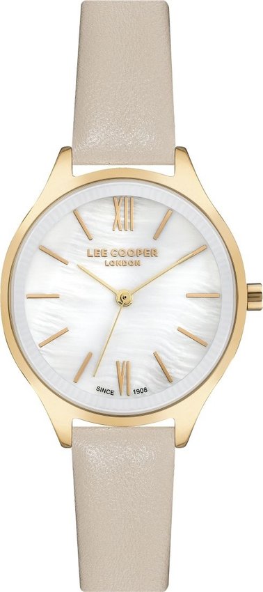 Zegarek damski LC07300.127 marki Lee Cooper to stylowe połączenie funkcjonalności oraz ciekawego designu. Charakteru nadaje wysokiej jakości tarcza w kolorze białym. Zegarek ten prezentuje godzinę w formacie analogowym dzięki czemu odczyt jest intuicyjny. Koperta jest w kolorze złotym szeroka jest na 31 mm - w kształcie okrągłym.