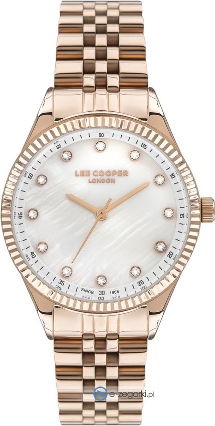 Zegarek damski LC07310.420 marki Lee Cooper to ciekawa pozycja dla ludzi ceniących sobie dbałość o szczegóły a także sprawne zachowanie mechanizmów. Stylu dodaje wysokiej klasy cyferblat w kolorze białym. Godzina prezentowana jest w sposób analogowy co niezmiernie łatwo pozwala ją odczytać. Koperta jest pokryta kolorem różowo złotym szeroka jest na 35 mm - w kształcie okrągłym.