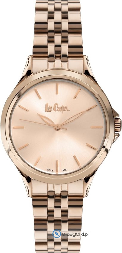 Model LC07313.410 marki Lee Cooper to gustowny zegarek naręczny damski, który wyposażono w pomysłowe rozwiązania i funkcje. Ciekawą stylistykę czasomierza osiągnięto z pomocą tarczy w kolorze różowo złotym. Zegarek ten pokazuje godzinę w formacie analogowym dzięki temu odczyt jest bezproblemowy. Koperta została pokryta kolorem różowo złotym szeroka jest na 36 mm - charakteryzuje się okrągłym kształtem.