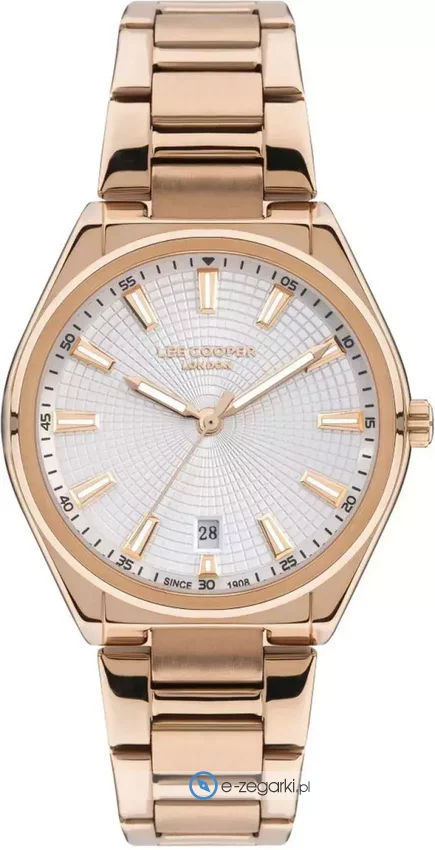 Zegarek damski LC07335.430 marki Lee Cooper to idealna propozycja dla ludzi ceniących sobie dbałość o detale jak również bezawaryjne funkcjonowanie mechanizmów. Styl zapewnia wysokiej jakości cyferblat w kolorze białym. Zaprezentowana metodą analogową bieżąca godzina jest czytelna i prosta do odczytania. Koperta została ozdobiona kolorem różowo złotym szeroka jest na 34 mm - w kształcie okrągłym.