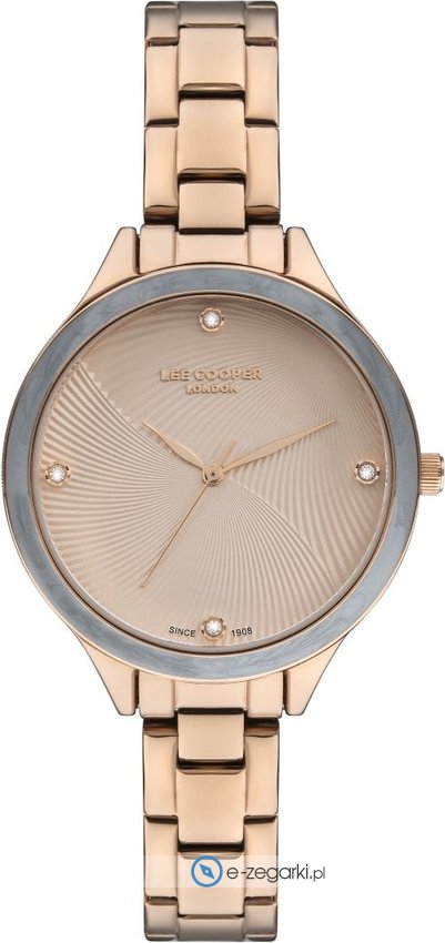 Zegarek damski LC07389.410 marki Lee Cooper to stylowe połączenie funkcjonalności i ciekawego designu. Wysokiej trwałości cyferblat zegarka pokryto różowo złotym kolorem. Godzina przedstawiona jest w sposób analogowy co niezmiernie łatwo pozwala ją odczytać. Koperta jest w kolorze różowo złotym szeroka jest na 34 mm - w kształcie okrągłym.