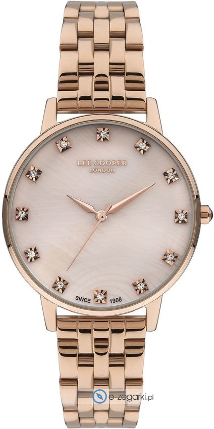 Model LC07402.410 marki Lee Cooper to gustowny zegarek naręczny damski, który jest wyposażony w pomysłowe rozwiązania oraz funkcje. Wysokiej jakości tarczę zegarka ozdobiono różowo złotym kolorem. Aktualna godzina zaprezentowana jest w sposób analogowy co niezmiernie łatwo pozwala ją odczytać. Koperta jest w kolorze różowo złotym szeroka jest na 36 mm - ma okrągły kształt.