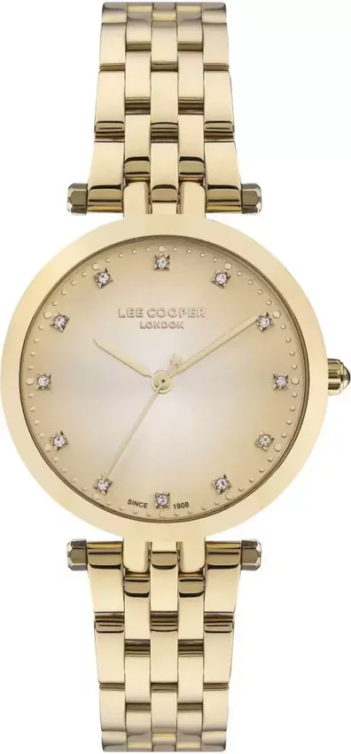 Model LC07411.110 marki Lee Cooper to elegancki zegarek naręczny damski, który wyposażono w pomysłowe rozwiązania i funkcje. Tarcza zegarka jest w kolorze złotym. Zaprezentowana metodą analogową bieżąca godzina jest czytelna i prosta do sprawdzenia. Koperta jest w kolorze złotym szeroka jest na 34 mm - w kształcie okrągłym.